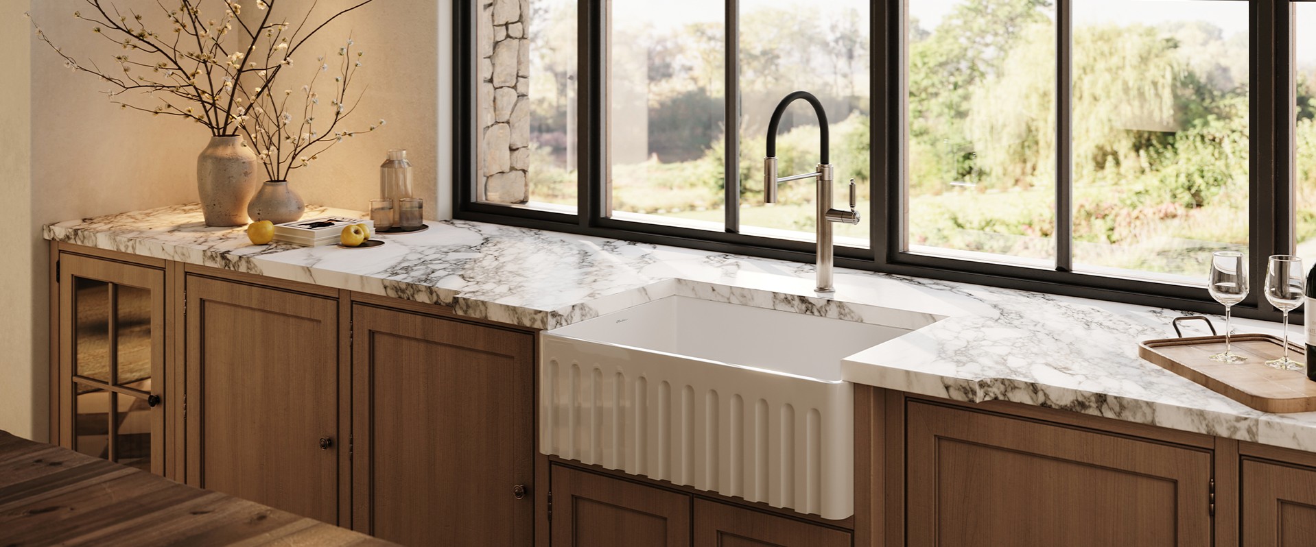 Traditional Sicily farmhouse sinks are reversible, allowing for installation with either a smooth or fluted front. Depending on the chosen design, Sicily sinks can be installed on, in or under the countertop.
